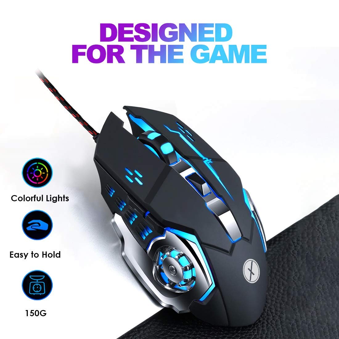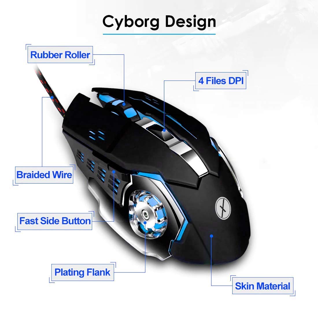 VIBOTON TINJI TJ-1 Wired USB Gaming Mouse,3200DPI LED Backlight 6 Button,4 Color Breathing Lights, ABS Durable Body for Gamers,1.5M Nylon Braided Cable